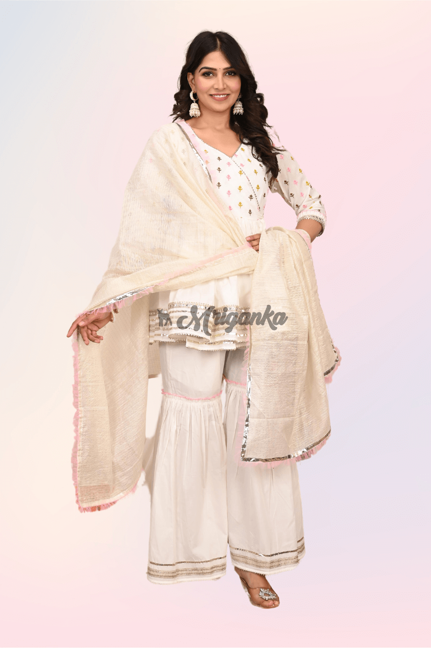 Paired with a luxurious Banarasi silk dupatta, adorned with intricate gota embellishments, this ensemble exudes serenity and understated charm. Perfectly balanced between traditional and contemporary, this set is ideal for both festive celebrations and casual gatherings, ensuring you look effortlessly chic on any occasion.